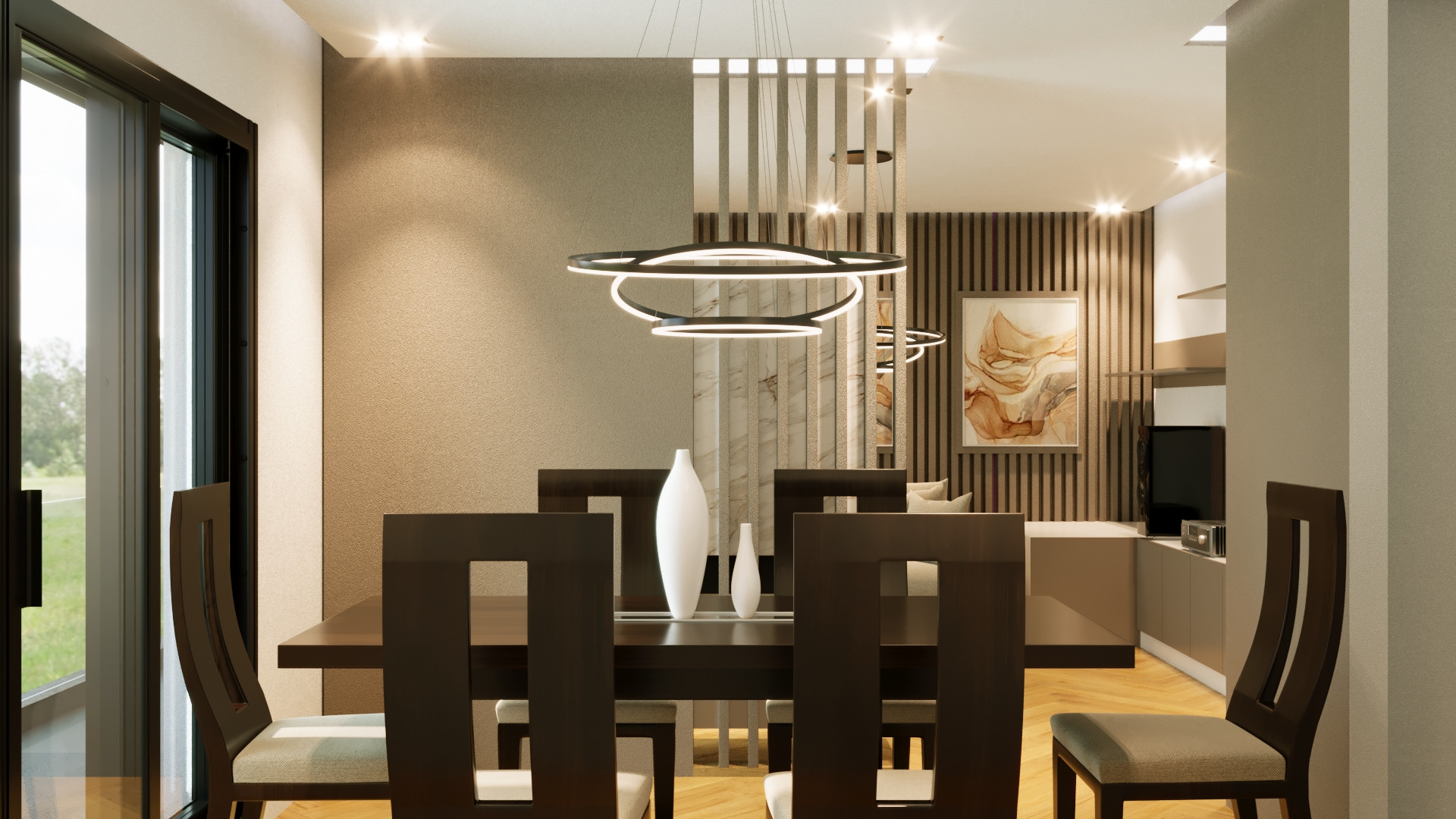 - A modern room divider subtly separates the living and dining areas, enhancing the layout’s openness while maintaining spatial definition.