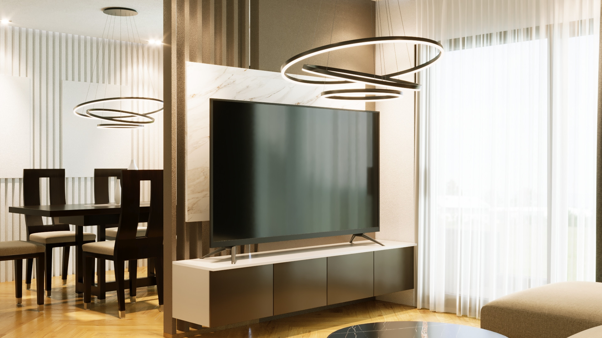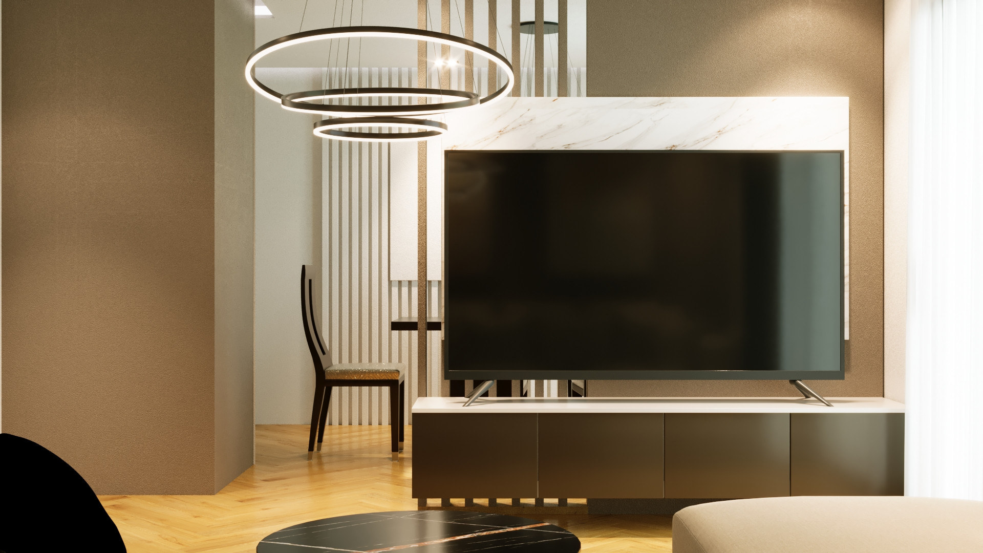 - The TV unit is thoughtfully designed with a white marble backdrop and sleek cabinetry, blending aesthetics with functionality.