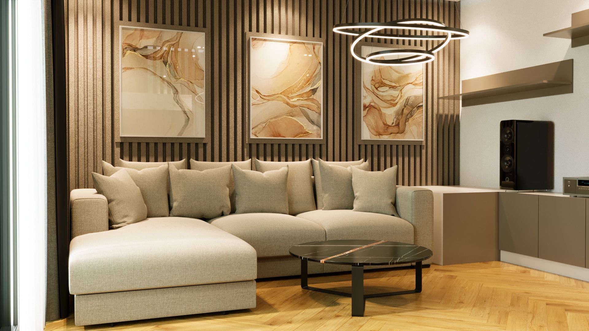 - The living area features a comfortable, oversized sectional sofa framed by textured panelling and curated abstract artwork. The neutral tones of the furniture complement the soft textures, creating a relaxing yet stylish atmosphere.
