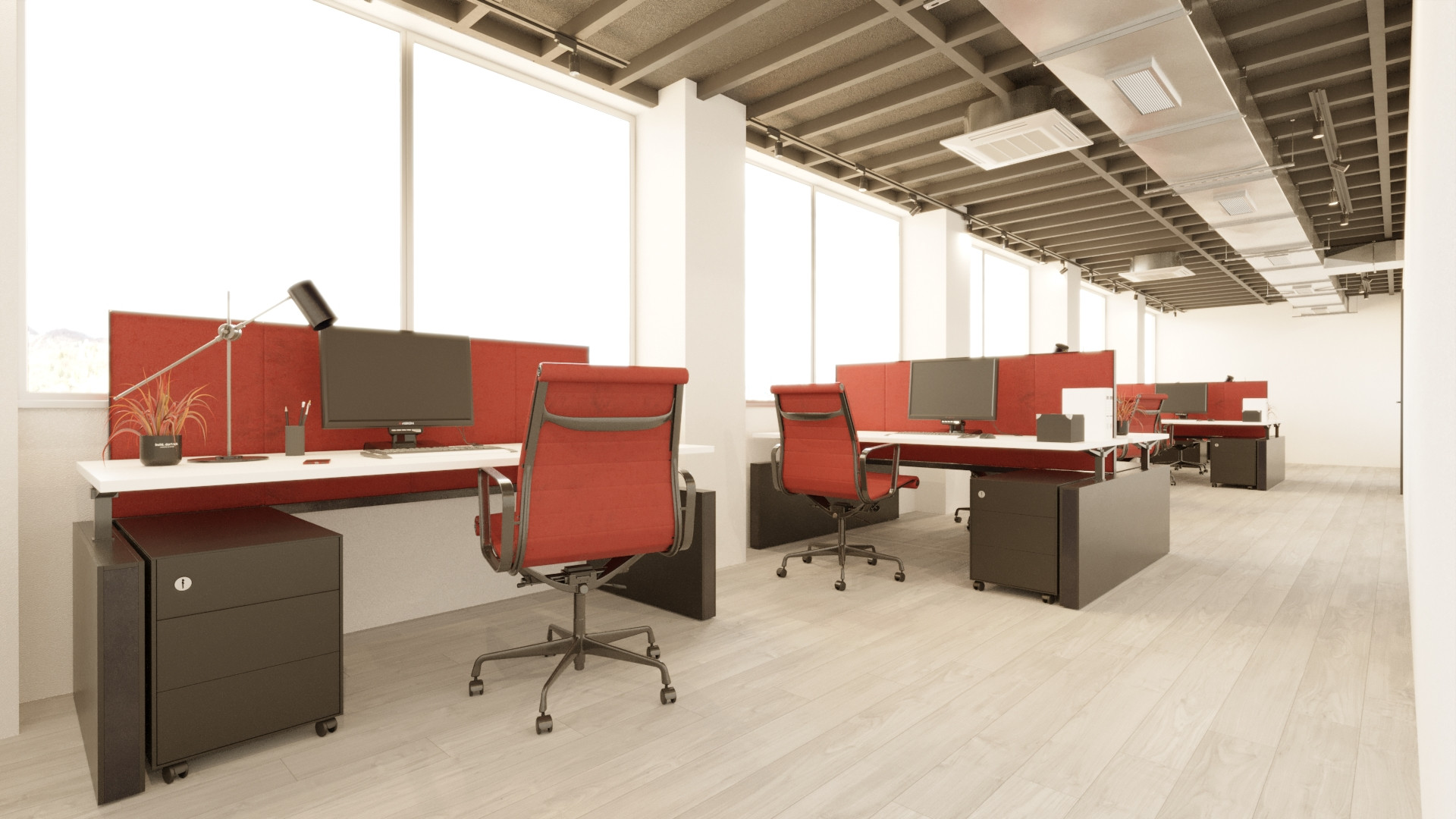- Vibrant red partitions: Adding warmth, personality, and subtle privacy to the layout.