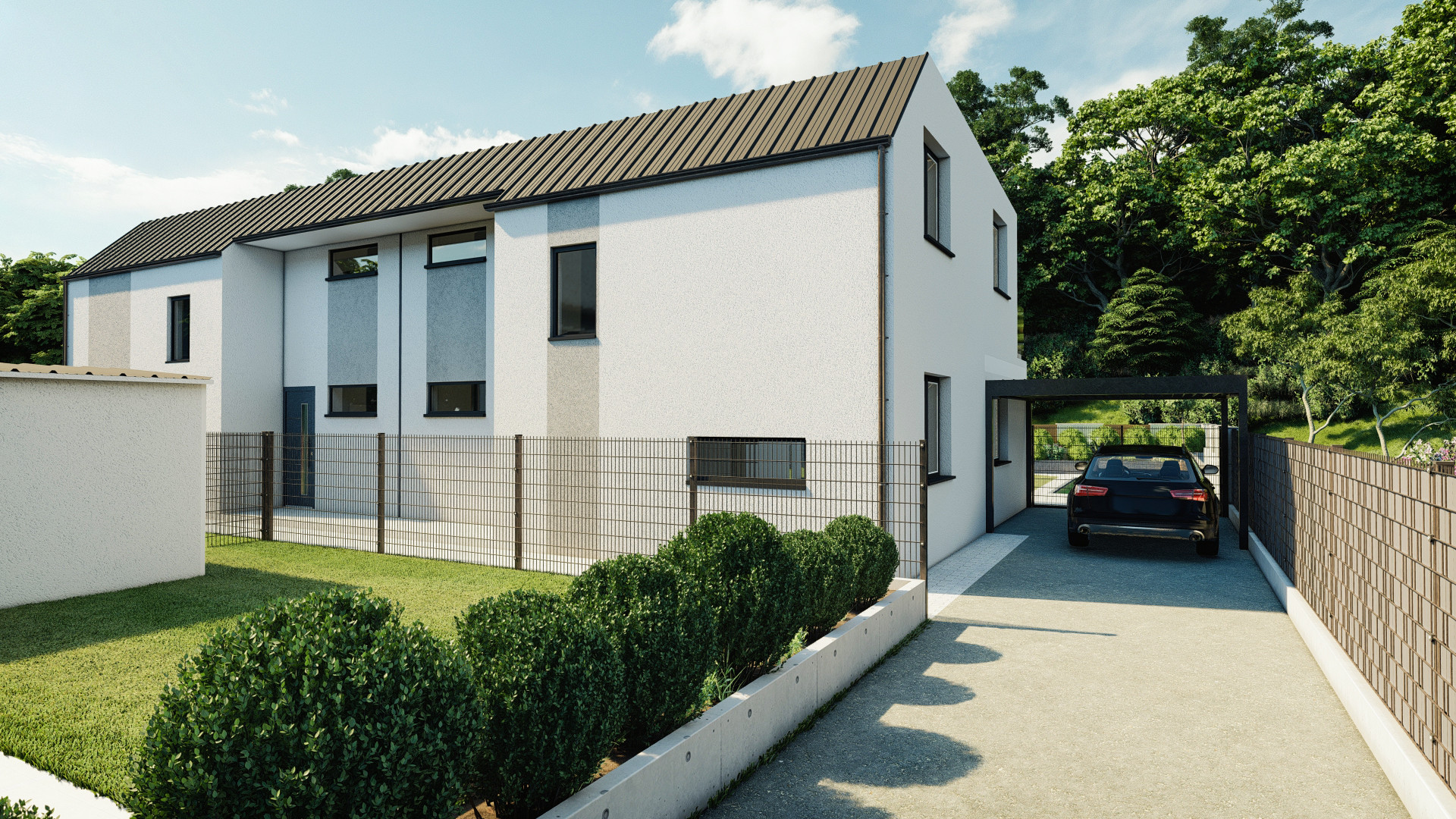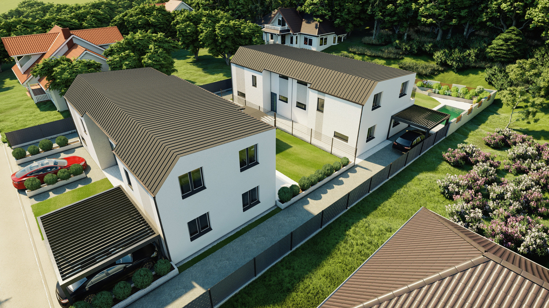 Nestled in the countryside, this project features two modern duplexes, each comprising two identical units. The homes share a cohesive aesthetic with clean white facades, contrasting brown roofs, and thoughtfully designed front yards. Each unit includes its own dedicated parking space, seamlessly integrated into the landscape.