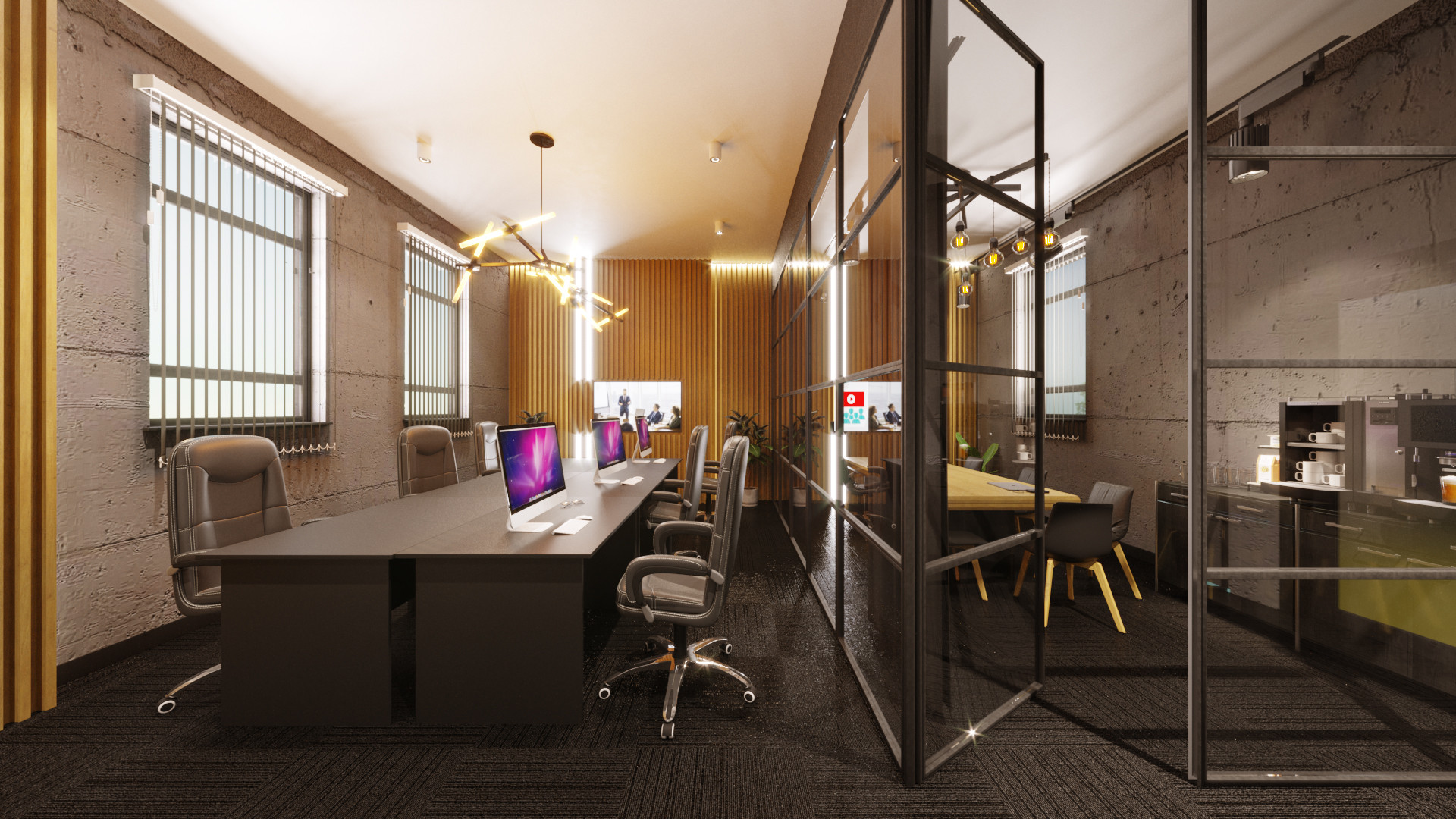 - Large glass partitions provide transparency while maintaining sound privacy, ensuring seamless collaboration and focus.