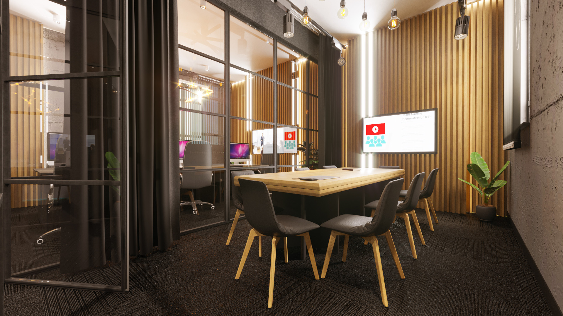 - The meeting room is designed with simplicity and functionality in mind, featuring a custom-built wooden table paired with modern black chairs.
