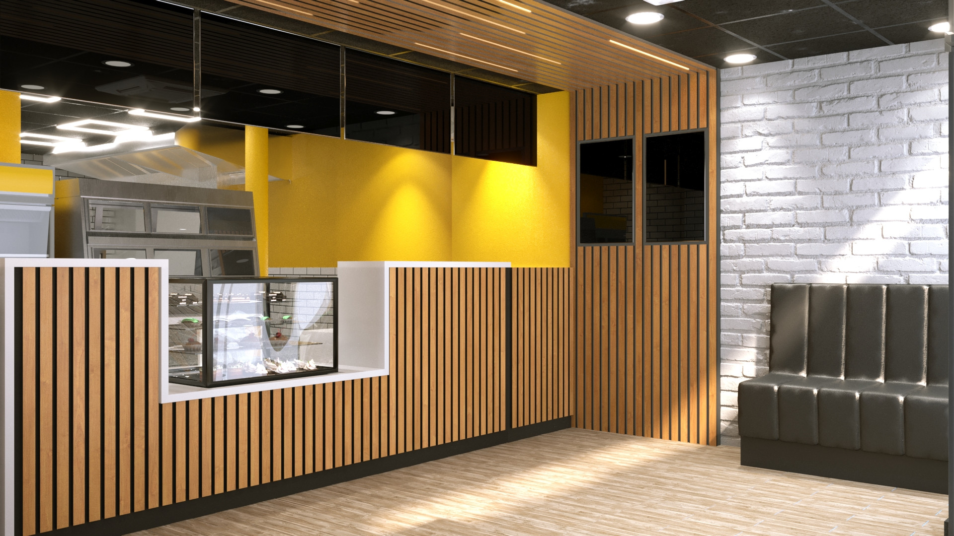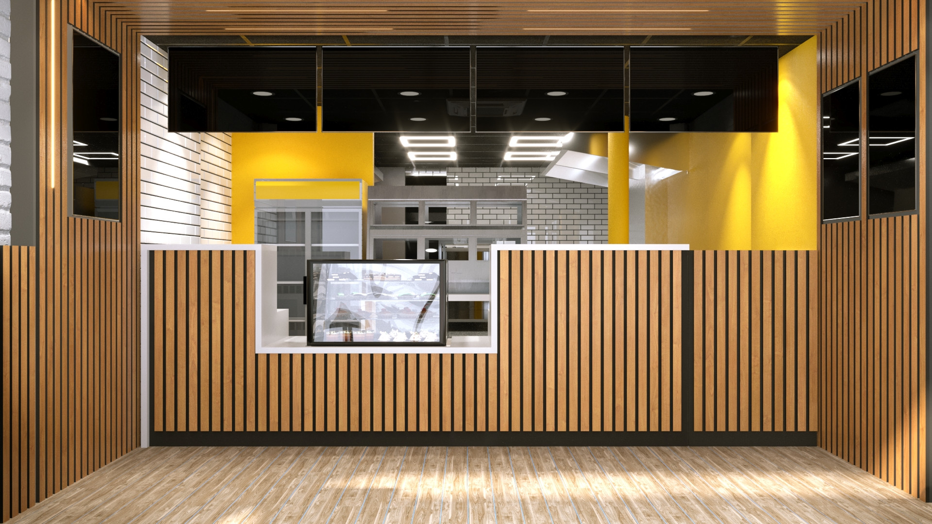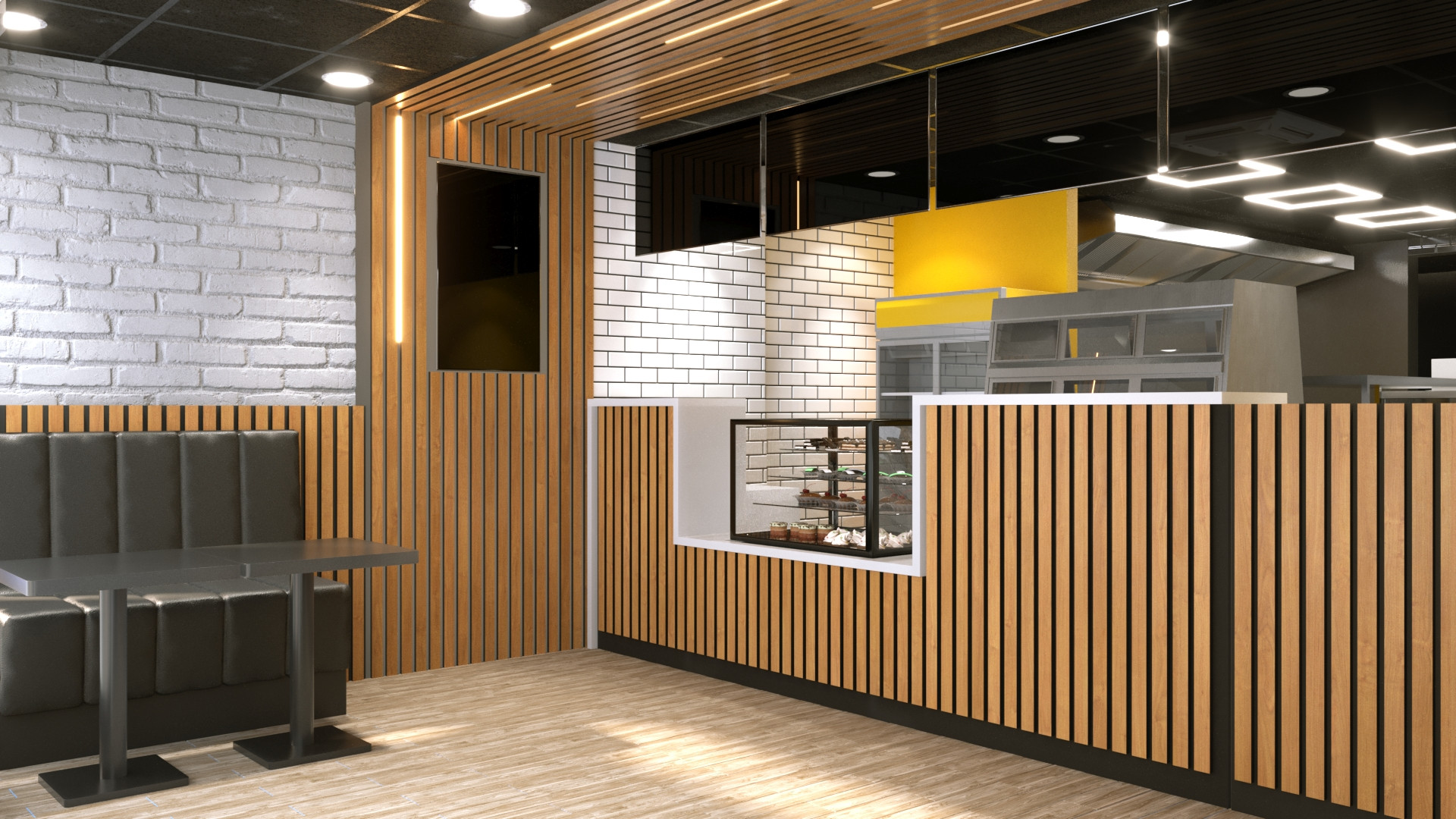 The new store design focuses on creating a professional and inviting space that aligns with the demands of a modern fast-food takeaway. Vertical wooden slats, clean white subway tiles, and bright yellow accent walls establish a bold visual identity. Black detailing and stylish lighting add contrast and depth, enhancing the overall aesthetic. The refurbishment also included optimizing the service counter layout to improve customer flow and display functionality—critical for busy burger and pizza delivery operations.