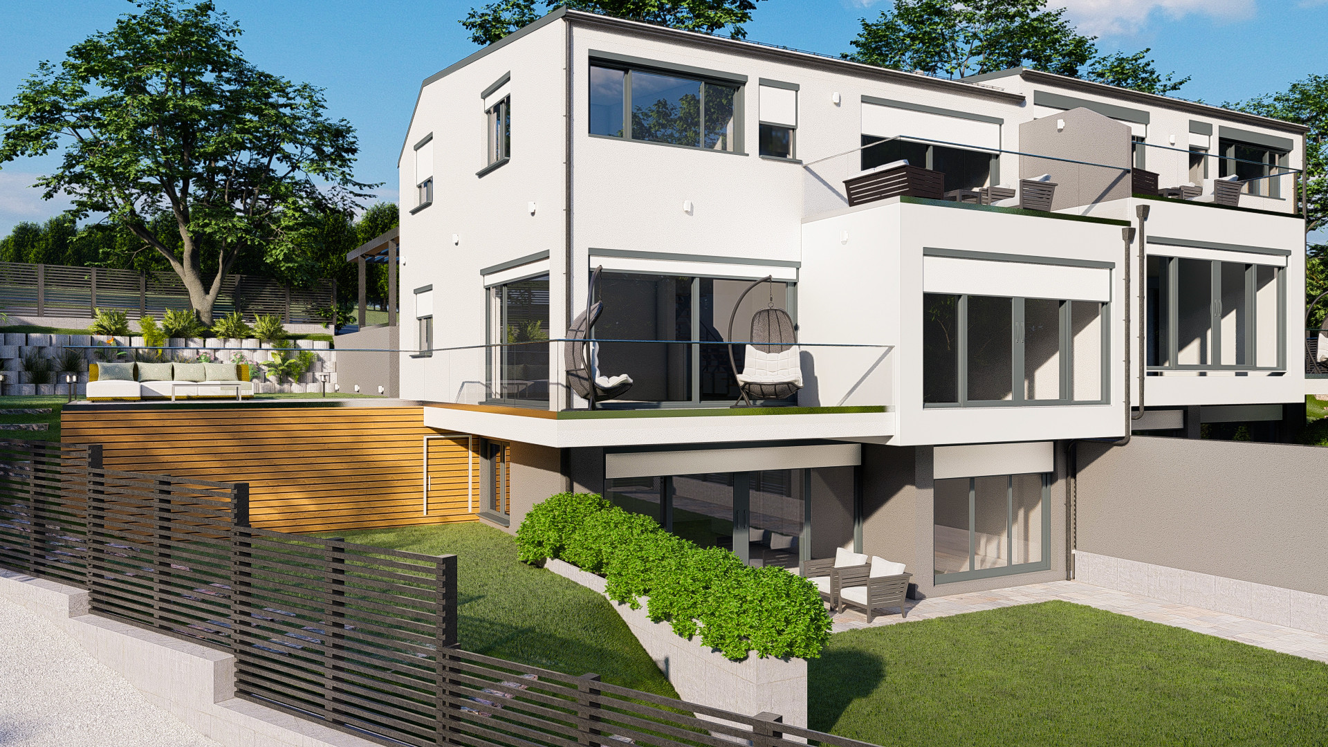 The townhouses feature a harmonious blend of natural materials, including wood details on light gray facades, large terraces, and expansive windows that flood the interiors with natural light. Each unit integrates a private garden, creating a serene environment where residents can connect with nature.