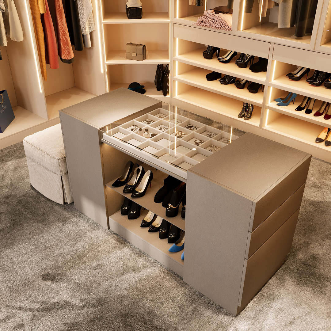 - A central island with a glass top includes compartments for jewellery and watches, combining display and storage with an elegant touch.